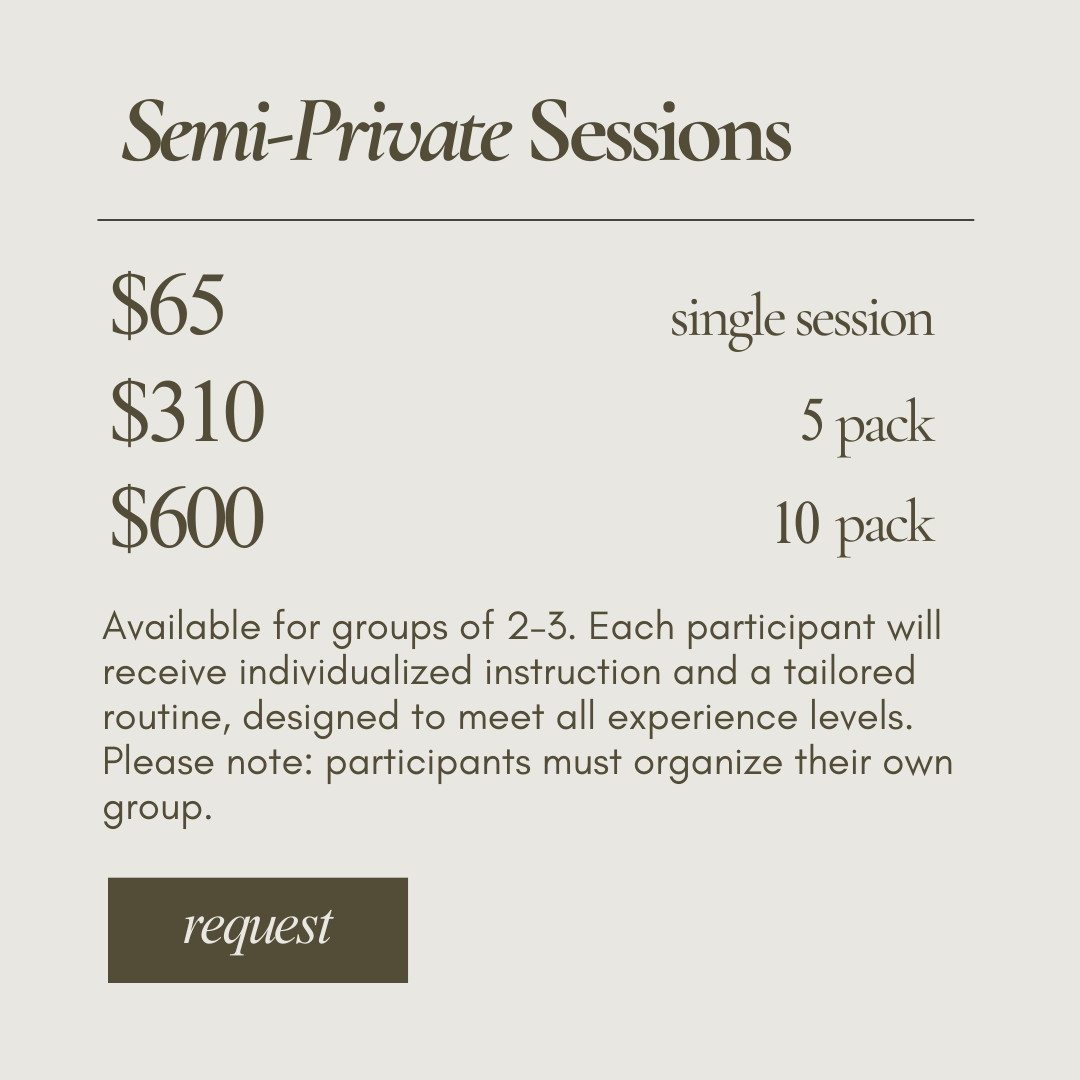 To ensure we can reserve your preferred times, we ask that you submit a session request before purchasing. This helps us confirm availability on our private session calendar and provide you with the best experience possible.